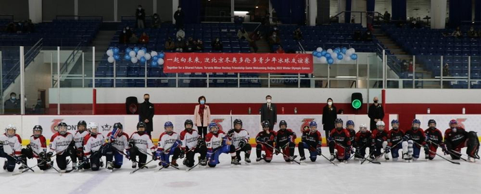 比赛在由华人球员组成的多伦多“未来之星”少年队、非华人球员组成的多伦多“枫叶之星”少年队之间激烈展开。参赛队员的年龄均为10岁以下,他们蹬冰挥杆,向北京冬奥会和全球冬奥健儿表达祝福。