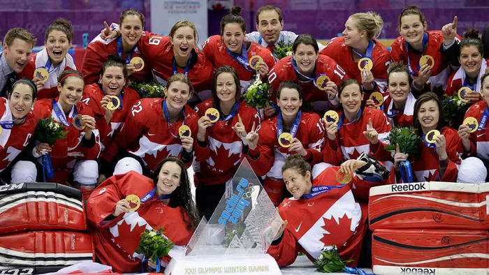 2014年,加拿大队在冬奥会女子冰球金牌加时赛中以3-2击败美国队后,聚在一起合影留念。来源:美联社