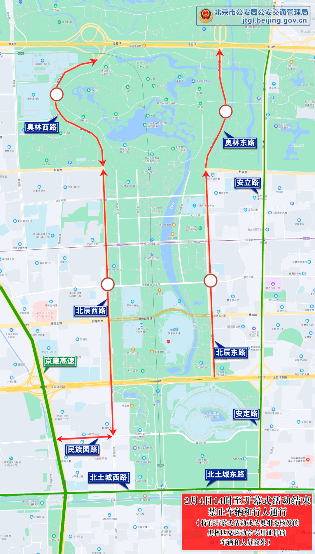 二、14时至开幕式活动结束,北辰西路、奥林西路、奥林东路南向北方向主辅路、北辰东路南向北方向主辅路、民族园路, 除持有开幕式活动或冬奥组委核发的奥林匹克运动会专用证件的车辆和人员外,禁止其他车辆和行人通行。社会车辆和公交车可经安立路、安定路、京藏高速公路、北土城西路、北土城东路绕行。