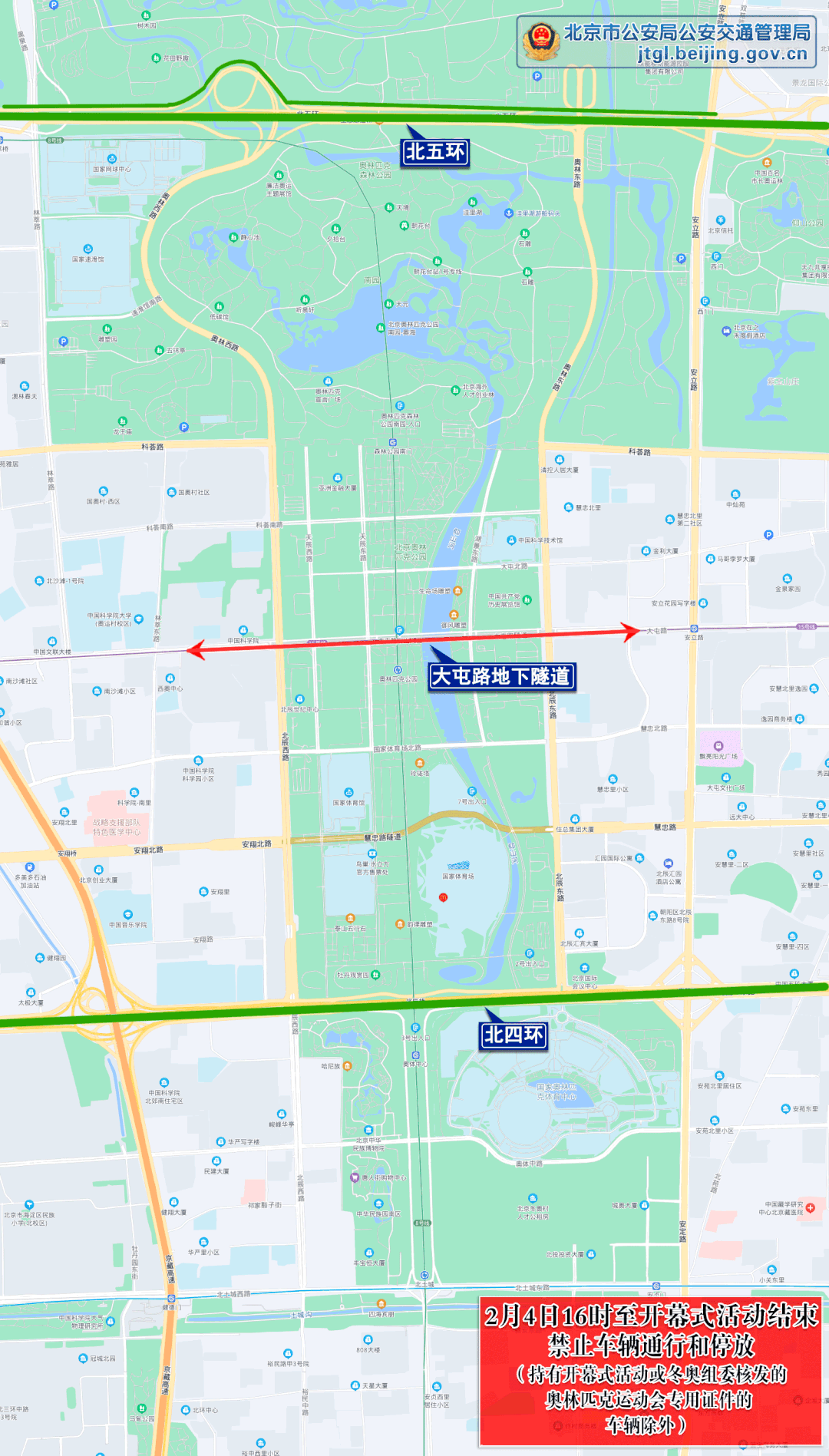一、6时至开幕式活动结束,慧忠路地下隧道、国家体育场北路、大屯路(不含大屯路地下隧道)、大屯北路、科荟南路、北五环路南侧辅路(奥林西桥至奥林东桥)、天辰西路、景观大道、天辰东路、湖景西路、湖景东路、奥林东路北向南方向主辅路、北辰东路北向南方向主辅路、北辰路南向北方向主辅路(民族园路至北辰桥), 除持有开幕式活动或冬奥组委核发的奥林匹克运动会专用证件的车辆和人员外,禁止其他车辆和行人通行。社会车辆和公交车可经大屯路地下隧道、北四环路、北五环路主路及北侧辅路、北土城西路、北土城东路绕行。
