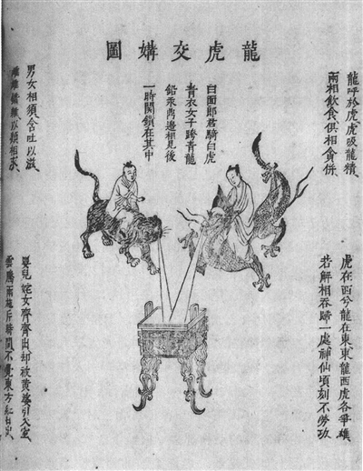 虎纵使作为神兽,也与世间其他生灵别无二致,也分雌雄。但就像前面所述那样,“虎者,阳物”——人类却一厢情愿地将虎视为男性与阳刚的象征。印度教的创世主神湿婆又被称为兽主,祂身披虎皮,象征着无上神威,具有无坚不摧的毁灭之力。在中国道教构建的宇宙—人体观中,山中白虎与海中青龙象征着阳与阴的两种极端对抗的力量。通晓龙虎阴阳之道,是凡人突破肉身,飞升成仙的关键。六朝时代伪托道教始祖张道陵撰著《黄书》即记载“开命门,抱真人,龙虎戏,三五七九,天罗地网”,以龙虎为喻,教导信徒修道秘要。16世纪流传甚广的道教书籍《性命圭旨》,则将龙虎交媾视为凡俗修仙必经之道,象征着阳刚之气的白面郎君身跨白虎,与象征阴性之气的青衣女子骑乘青龙,一同将阴阳精气摄入丹鼎之中,化作不老仙方: