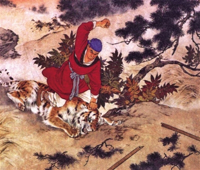 人类为了自己的贪欲而残杀虎,霸占了虎所栖居的山林。这个神话传说固然将人类表现得诡诈多端,但从另一个角度来说,人与虎的故事,也是人类文明发展的历程。人类对虎的杀戮,贯穿于人类文明演进的过程之中。《水浒传》中武松打虎的故事已然脍炙人口。《西游记》开场不久,就有一名猎户用钢叉刺穿了老虎的心肝,并且要把烹煮好的老虎肉奉献给玄奘食用。后来成了玄奘徒弟的孙悟空也照头一棒打死了一只老虎,随后砍下虎头虎爪,剥下虎皮,做成了他标配穿戴虎皮裙。