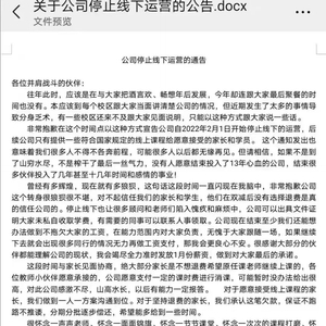 网传公告称,停运并非全由疫情和“双减”政策造成,前几年的盲目扩张和巨额亏损导致现金流断裂也是部分原因。