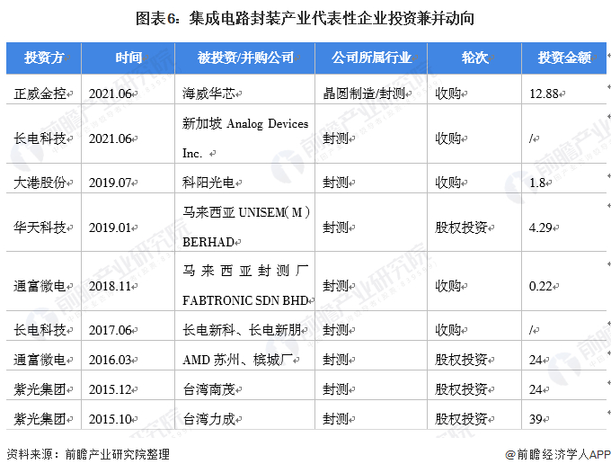 2020年以来,集成电路封装产业代表性企业的投资动向主要包括战略投资、战略收购、股权投资等。集成电路封装产业代表性企业最新投资动向如下: