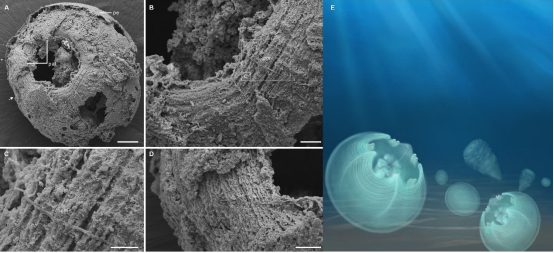 陕南早寒武世宽川铺组化石扫描电镜照片显示其环形肌肉(A-D)及系统化石复原图(E)