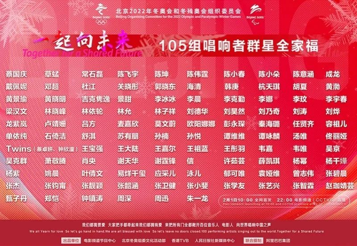 2月1日,北京2022年冬奥会和冬残奥会口号推广音乐短片《一起向未来》在全网上线。这首长达11分钟的歌曲,汇集担任“唱响者”的音乐人、电影人共计105组。网友评论“空前的演唱阵容,各个年龄段都能看到自己的偶像”。