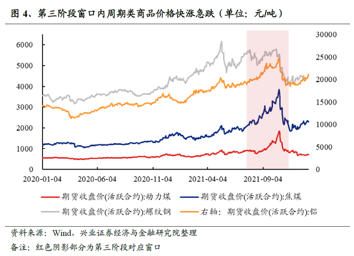 第三阶段,在7月23日至11月10日间,政策端的扰动不断叠加“类滞胀”隐忧,使A股不断震荡。7月下旬起,政策端不断出现扰动,对市场情绪造成压制,如“双减”、银保监会15号文、互联网反垄断等。而从8月份起,重磅政策“能耗双控”落地,多地高能耗企业停工停产,但以煤炭为代表的大宗商品价格却一路走高。7-9月PPI逐步走高,而PMI逐步下跌至荣枯线以下,市场对“类滞胀”的隐忧逐步升温。政策冲击叠加对“类滞胀”的担忧情绪,使市场震荡不断。本阶段万得全A下跌2.1%。