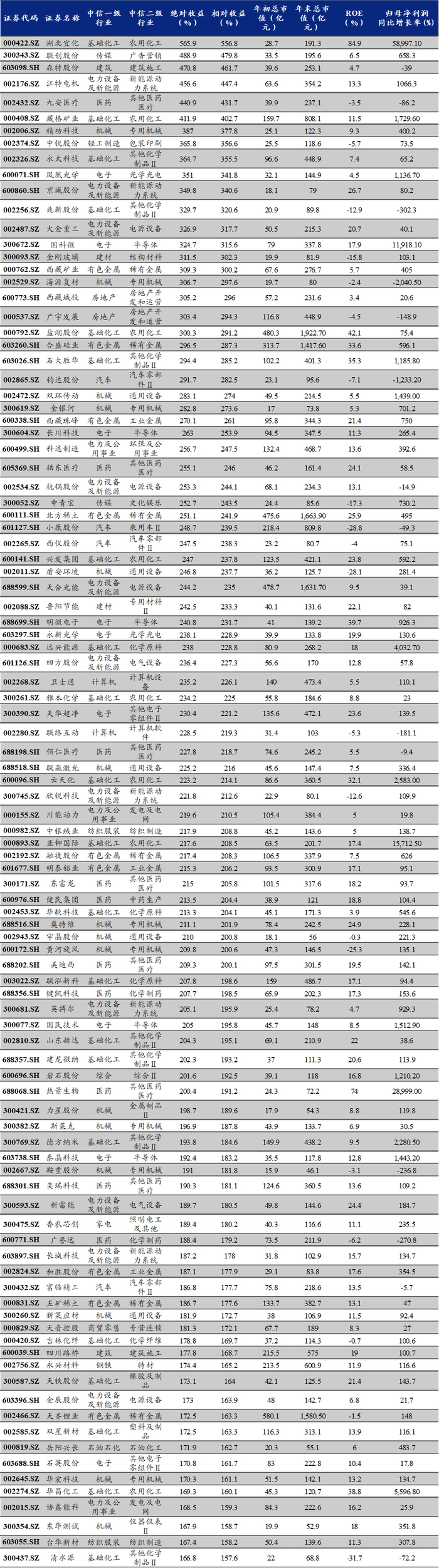 细分到二级子行业来看,属于中游制造大类的专用机械、新能源动力系统、通用设备、电源设备;属于中游材料大类的农用化工和其他化学制品;属于上游资源大类的稀有金属;属于TMT大类的半导体;属于消费大类的其他医药医疗均涌现出了较多的牛股。