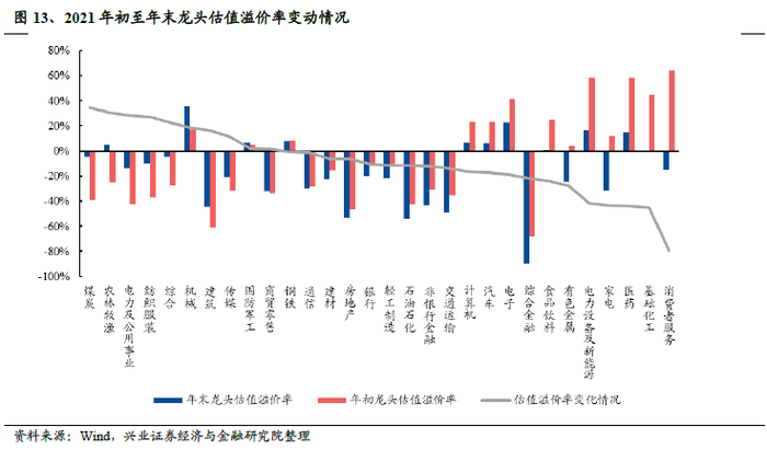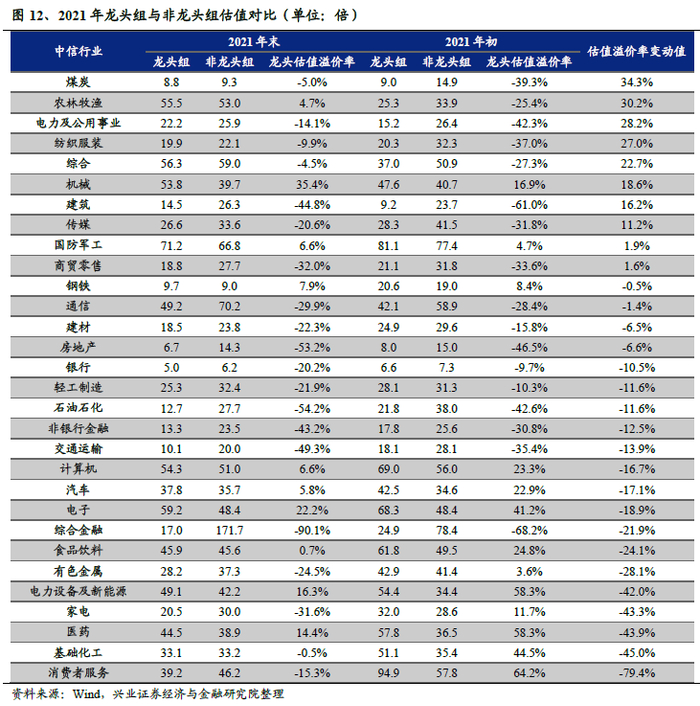 2021年,多数行业出现龙头估值溢价下降现象,印证了“没有永远的护城河”。1)将各行业板块中的个股根据市值分层,市值前20%的个股为“龙头”组,市值后80%的个股为“非龙头”组;2)分别计算2021年初和2021年末时“龙头”组和“非龙头”组的市盈率中位数之差,再计算差值对“非龙头组”市盈率中位数的比值,来衡量龙头估值溢价率;3)以年末的龙头估值溢价率减去年初的龙头估值溢价率,来度量2021年度的龙头估值溢价变动率情况。在中信30个一级行业中,10个行业龙头估值溢价提升,20个行业龙头估值溢价下滑。多数行业的龙头估值溢价下滑,一定程度上反映了“没有永远的护城河”。深入到各行业来看,煤炭、农林牧渔、电力及公用事业板块龙头估值溢价提升最显著,消费者服务、基础化工、医药板块龙头估值溢价率下降幅度最大。