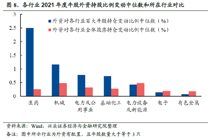 外资“钟情”医药、机械及公用事业行业的牛股。2020年末至2021年末,外资对A股整体的持股比例变动值中位数为0.22%,而外资对牛股持股比例的变动值中位数达到0.56%,外资对牛股增配比例普遍高于A股整体。而深入到各个行业来看,剔除掉牛股数量不足3只的行业后,计算外资对各行业的牛股持仓变动比例的中位数,并计算外资对各行业全体股票持仓变动比例的中位数,可知在外资有配置、且牛股数量大于等于3只的7个行业中,有4个行业,外资对牛股的持股变动比例中位数高于外资对行业全体股票的持股变动比例中位数。其中外资对医药、机械、电力及公用事业牛股的增配比例中位数较高,分别为2.5%、1.2%和0.8%。