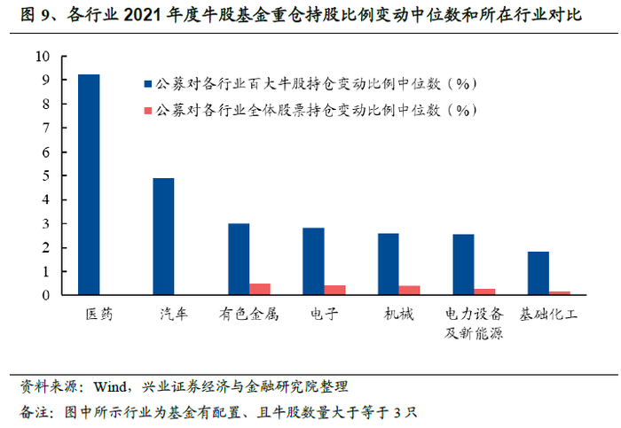 公募基金则显著加仓牛股。2020年末至2021年末期间,基金对A股整体的重仓持股比例变动值中位数为0.07%,而基金对牛股持股比例的变动值中位数达到2.60%,基金对牛股增配比例普遍高于A股整体。而深入到各个行业来看,剔除掉牛股数量不足3只的行业后,计算基金对各行业的牛股持仓变动比例的中位数,并计算基金对各行业全体股票持仓变动比例的中位数。可知在基金有配置、且牛股数量大于等于3只的7个行业中,基金对牛股的持股变动比例中位数均高于基金对行业全体股票的持股变动比例中位数。其中医药、汽车和有色金属牛股的增配比例中位数较高,分别为9.3%、4.9%和3.0%。