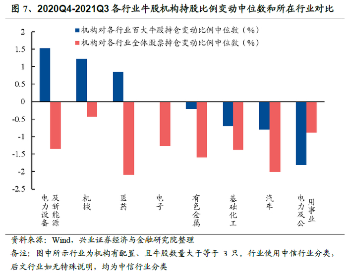从机构资金偏好来看,机构投资者对牛股增配比例普遍高于A股整体,体现了机构话语权的持续增强。计算2020年末和2021Q3末机构对A股整体各只股票的持股比例,并算出变动值,再求出变动值的中位数,可知2020-2021Q3期间,机构对A股整体的持股比例变动值中位数为-1.34%,而机构对百大牛股持股比例的变动值中位数达到0.28%,可见机构对牛股增配比例普遍高于A股整体,机构话语权持续增强。