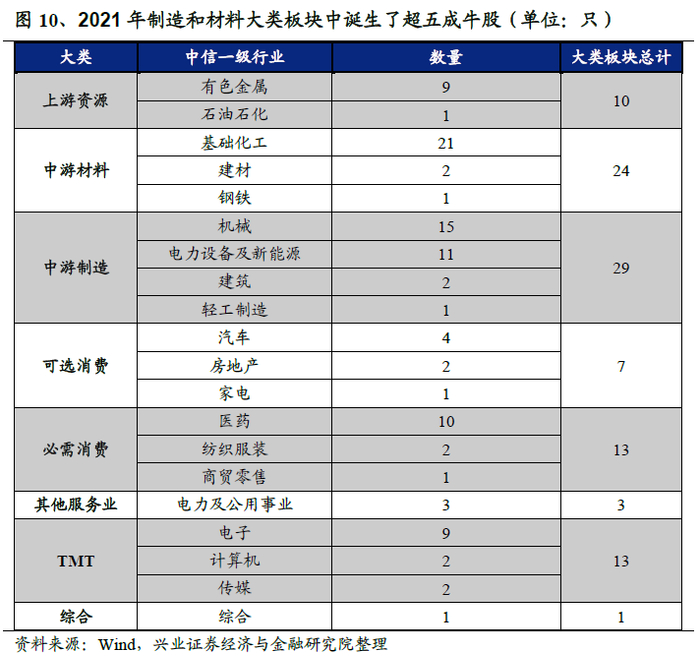 中游制造和中游材料板块诞生的牛股数量最多。将中信行业重新划分为上游资源品、中游材料、中游制造、可选消费、必需消费、其他服务业、TMT、金融和综合九大板块,并统计分布于各大类板块的牛股数量。可以发现,中游制造和中游材料板块诞生的牛股数量最多,分别贡献了数量占比达29%和24%的牛股,合计占比超五成。
