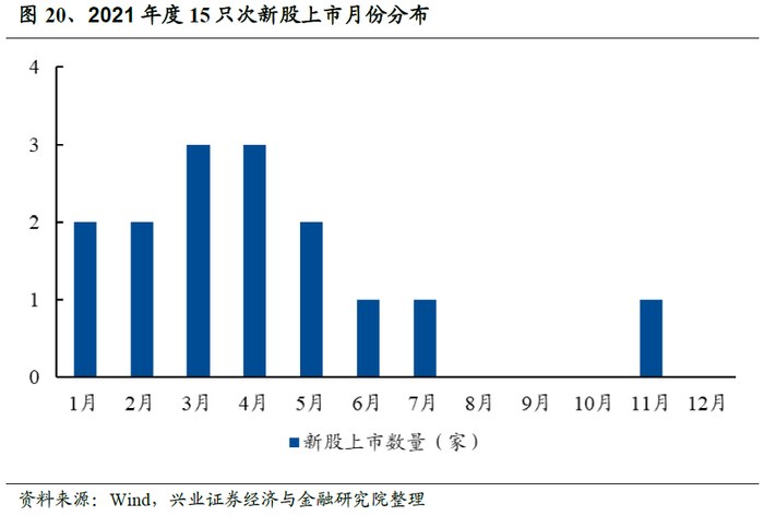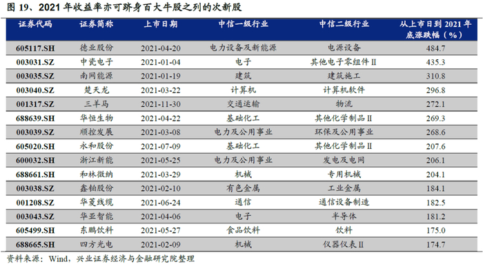 在前文的分析中,为便于统计,我们剔除了2021年内上市的次新股,若按上市首日到2021年底的收益率计算,多达15只次新股涨幅超过167%,本应跻身百大牛股之列,新股效应显著。因此,我们也会对这些次新股进行单独分析。