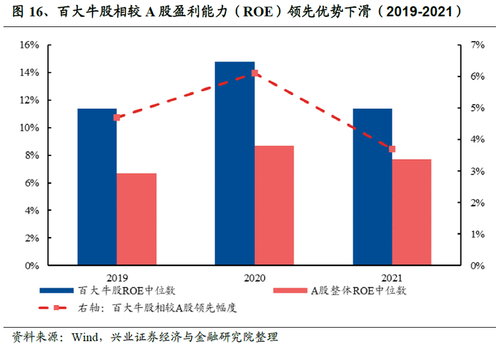 相较于2019、2020年,牛股对A股整体ROE的领先幅度有所收窄。2021年前三季度,百大牛股的ROE中位数为11.4%,而A股整体ROE中位数为7.7%,百大牛股的领先幅度达3.7%。而2019年,百大牛股ROE中位数、A股整体ROE中位数分别为11.4%、6.7%,百大牛股领先幅度为4.7%,高于2021年。2020年,百大牛股ROE中位数、A股整体ROE中位数分别为14.8%、8.7%,百大牛股领先幅度为6.1%,同样高于2021年。