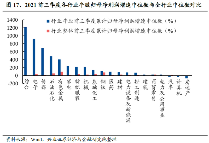 深入到各行业来看,年度牛股的归母净利润增速水平也大多领先所在行业整体。分别计算各行业的牛股归母净利润增速的中位数,并计算各行业全体股票归母净利润增速的中位数,可知在有牛股分布的20个行业中,其中有17个行业,牛股归母净利润增速中位数高于行业全体股票归母净利润增速中位数。其中综合、电子、传媒、石油石化、有色金属、家电、纺织服装、机械、基础化工、钢铁等行业的牛股归母净利润增速中位数均超过100%,其中虽然综合行业牛股归母净利润增速中位数达到1210.2%,但因其中仅有岩石股份1只成分股,具有偶然性。电子行业9只牛股的归母净利润增速中位数达926.3%,这主要得益于“缺芯潮”下半导体价格的迅速上行。