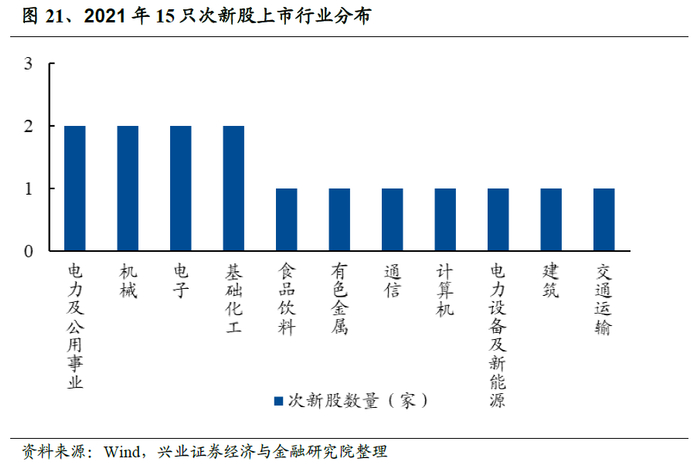 电力及公用事业、机械、电子、基础化工等板块中诞生的次新股“牛股”数量较多。在15只高涨幅次新股中,有2只来自电力及公用事业板块,2只来自基础化工板块,1只来自有色金属板块,1只来自电力设备及新能源板块,1只来自建筑板块,与碳中和主线密切相关。其余次新股“牛股”有2只来自机械板块、2只来自电子板块,1只来自通信板块、1只来自计算机板块,1只来自交通运输板块,一定程度上体现了2021年市场对“小高新”的偏好。