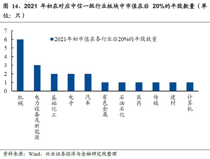 多只年初市值排名靠后的个股,在2021年均进入百强牛股行列,一定程度上反映了市场审美从龙头股到“小高新”的变迁。通过计算100只牛股2021年初在中信一级板块中的市值分位数,仅有13只牛股市值排名在行业前20%。而市值排名在行业后20%的牛股则有21只,分别来自机械、电力设备及新能源、基础化工、汽车等11个板块。结合上文对龙头估值溢价变动情况的计算可知,11个板块中,除去机械、传媒两个板块龙头估值溢价率在2021年提升,其余9个板块的龙头估值溢价在2021年均有所下降。多只在年初市值排名靠后的个股,最终进入牛股排行榜,并且被机构关注甚至重仓,反映市场审美从聚焦大龙头延伸至“小高新”。