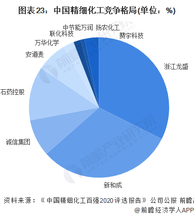 根据《中国精细化工百强2020评选报告》数据对企业精细化工主营业务进行汇总分析,中国精细化工行业市场集中度低,CR10仅为约12%,其中浙江龙盛集团股份有限公司位居榜首,浙江新和成股份有限公司和河北诚信集团分列二三位,营收占比分别约为4%和1%。表明中国精细化工行业整体市场集中度低,且从一定程度上说明,企业无法形成核心竞争力优势,即产品同质化较为严重。结合上述细分子行业研究分析数据,初步判断细分市场间竞争程度激烈且行业内产品同质化问题较严重。