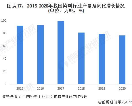 2015-2020年,中国涂料染料产量波动下降。尤其是近两年我国染料行业产量呈现萎缩的趋势,这主要是受到疫情影响停工减产所造成的;2020年涂料染料产量接近77万吨,同比下降约3%。结合涂料染料行业正在逐步复苏的需求市场来看,涂料染料供给市场在未来将有所恢复。
