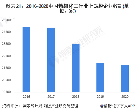 2016-2020年,中国精细化工行业企业数量逐年下降。2020年企业数量进一步下降,规模达到21722家。表明近五年来受整体经济环境下行与化工行业相关环保政策收紧的影响,中国精细化工行业参与热情有所下降,行业内横向整合趋势明显。