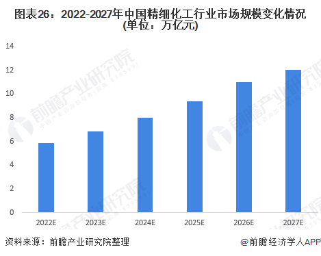 根据Marketupdate发布的《2021全球精细化工品市场报告》,Marketupdate预测全球精细化学品市场将以相当大的速度增长。亚太地区将在未来几年占据更多的市场份额,特别是在中国地区,预计未来行业年复合增长率将超过全球精化行业年复合增长率。且结合中国化工协会2019年对于精细化工行业2021年总产值的预测,初步估算,2022-2027年中国精细化工行业市场规模逐年上升,且2027年市场规模有望超过11万亿元。