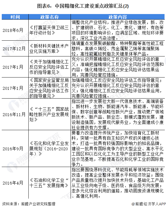 精细化工是石化产业的重要组成部分。中国精细化工行业起步较晚,“八五”规划提出重点发展精细化工,“九五”确立精细化学品为结构调整的重点领域,而“十二五”规划期间,受到关键技术的制约,国内精细化工和新材料方面发展较为缓慢,基于此发展背景,“十二五”规划明确指出,精细化工行业应积极技术创新,大力生产环境良好型产品和高附加值的化工新材料,以求缩短与发达国家在技术水平上的差距。而到了“十三五”期间,精细化工行业的发展主题变成围绕石化工业转型升级,依据各省市原有产业基础因地制宜,以建设国家重要的战略性石化产业基地为目标,进一步扩大油气加工、乙烯生产、新型煤化工等生产规模,延伸产业链条,促进石油化工与煤化工产业耦合发展。