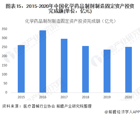 2015-2020年中国化学药品制剂制造固定资产投资完成额呈现波动变化趋势,且波动范围为200-350亿元。2020年固定投资完成额达到252万元左右,同比增长约11%,结合化学制剂行业不断上涨的需求空间来看,化学制剂行业处于上升周期,预计未来行业市场规模将进一步上升。