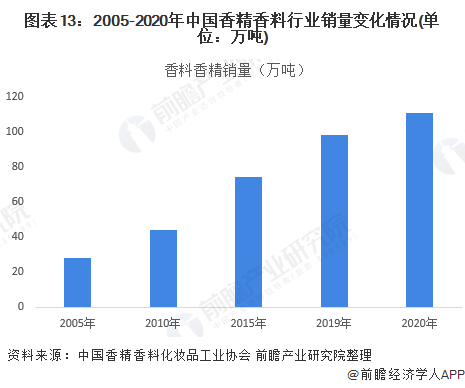 2005-2020年,中国香精香料行业销量逐年上升。2020年,中国香精香料销量超过110万吨,同比增长13%。由于国内市场发展较晚,供需远未达到饱和状态,因此,未来中国香精香料市场有较大上升空间。