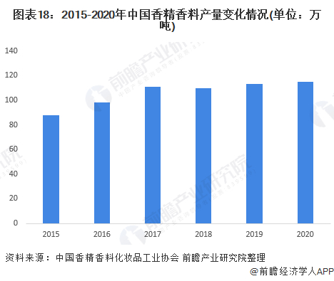 从近年来中国香精香料产量和销售收入统计情况看,香精香料行业呈现稳步增长的态势,香精的生产已基本满足人民生活和工农业生产的需求,产量由2015年的88万吨增长至2019年的113万吨,结合2020新冠疫情对香精香料不同产品部门的影响差异,经过初步估算,2020产量将保持小幅增长,将达到115万吨左右。