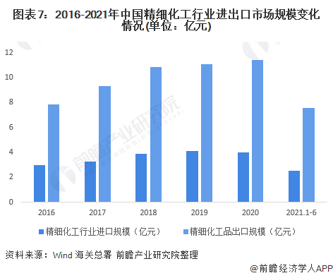 进口规模方面。2016-2020年中国精细化工进口规模逐年上升,但增幅有所缩减。2020年受疫情影响,进出口贸易受阻,精细化工品规模达到4亿元。2021年1-6月进口规模已经超过2.5亿元,有望超过2020年规模恢复疫情前水平。