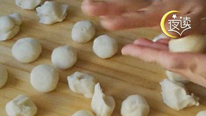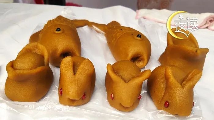 接着便是做金元宝。金元宝寓意财源广进。大人们熟练地用双手将年糕搓成长长的圆条,均匀地将十来厘米的糖糕圆条分成三段,两端压扁,我们称呼为“元宝翼”,然后向上包住中央元宝心,再用筷子将元宝翼和元宝心之间压一下。一个金元宝就做好了。做金元宝看上去简单,但做起来真的有点难,没有几年的工夫,还真做不出形象逼真的元宝来。
