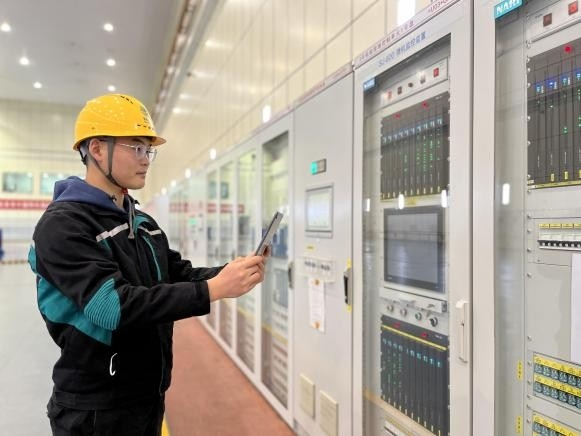 2月1日大年初一,国网新源张河湾公司宋世铎,在地下厂房发电机层巡视记录发电电动机运行参数。