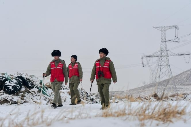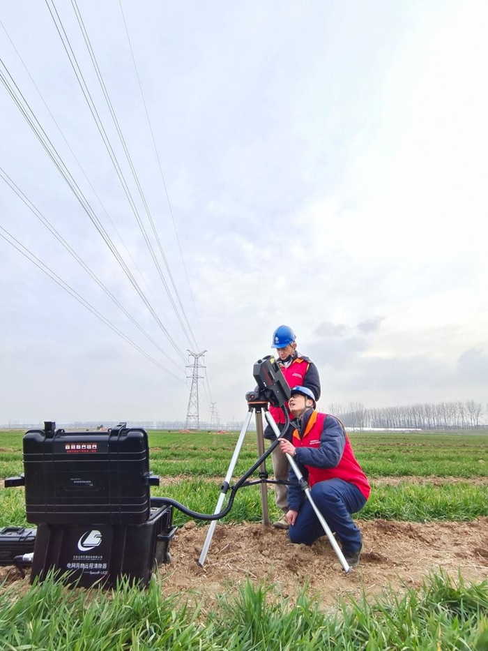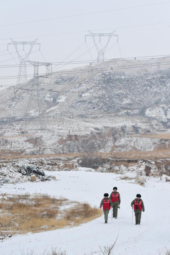 2月3日下午,冀北唐山市丰南区供电公司员工张晓峰、李东胜巡视辖区线路、设备。