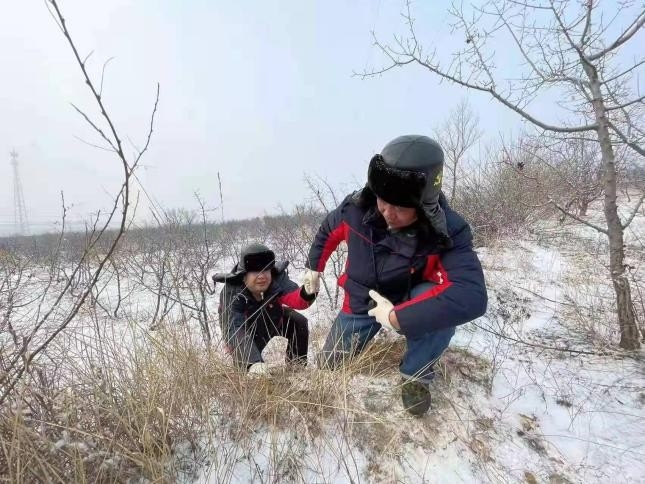 在田间巡视至某处杆塔,地上堆有秸秆,还散落了大量塑料薄膜垃圾。一位师傅说:“这些秸秆和塑料薄膜在大风天气极易引起线路故障,我们必须对其进行加固!”紧接着,队员们分头将大片塑料薄膜和较长的秸秆堆放在一起,用石头压住,不一会儿大伙儿累的气喘吁吁,呼出阵阵白气。