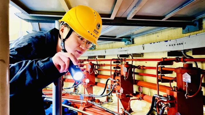 大年初一,国网新源泰山公司值长庄广明在水车室对导叶接力器进行检查,确保机组安全稳定运行。
