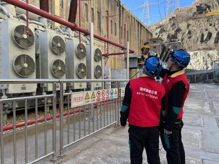 国网新源潘家口电厂共产党员服务队队员梁国辉和沈晶凯“加餐”进行主变红外测温工作。
