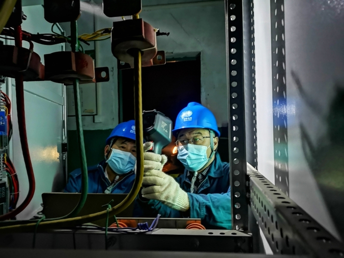 2月3日夜,山东淄博供电公司员工闫志强、周磊在淄博市周村区北郊镇大七村2号台区配电室开展负荷监测。为确保冬奥会开幕式期间电网可靠运行、保障居民及时收听收看开幕式盛况,该公司组织节日值班人员对重要线路、重点区域和变压器负荷超过50%的台区进行重点监测,确保设备可靠运行,为线路不停电提供可靠保障。(李汉栋)