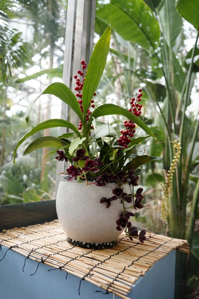 该组作品采用有鲜艳花序的丽穗凤梨‘红玉扇’衬托暗红色的彩虹千年木,形成明暗对比,在背景部分则使用两株较为细高的羚羊石斛,并搭配金色尤加利叶共同装饰,使得整个组合盆栽作品形成稳定的构图。