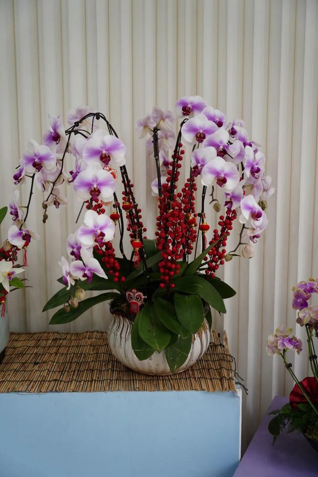 该组作品将多株粉红色蝴蝶兰进行组合造型,并且搭配红果装饰物、红色小灯笼营造喜庆氛围,给人以视觉冲击。作品取名为“幸福安康”,正是因为蝴蝶兰有“幸福长久”的美好喻意,好似传递幸福的蝴蝶飞入千家万户。