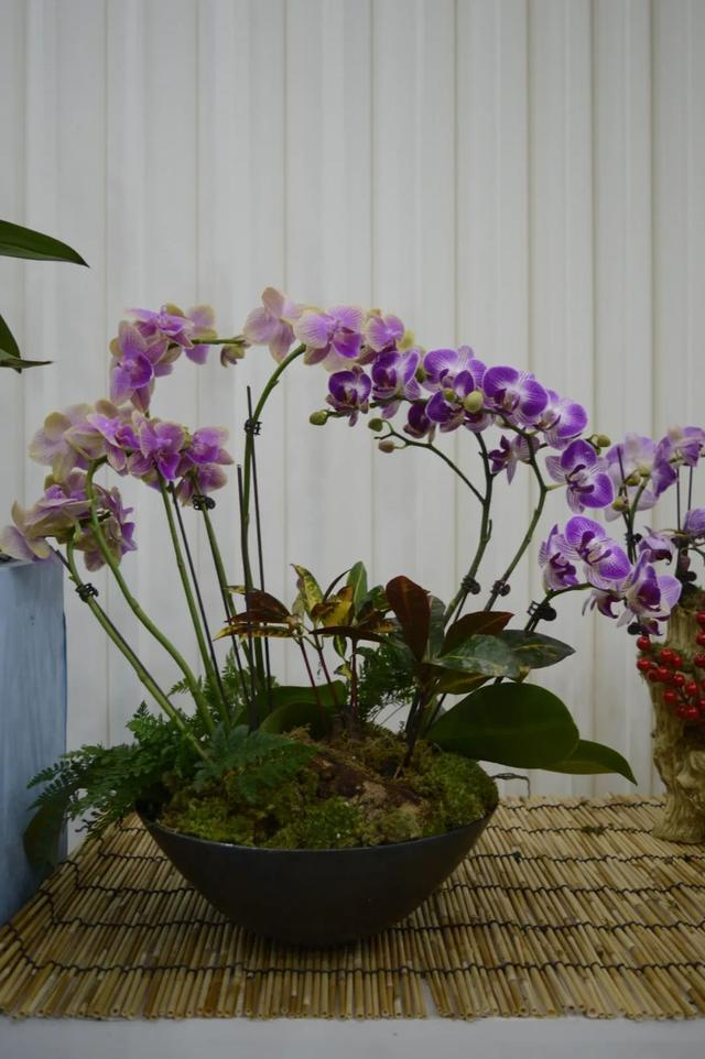 该组作品比较简洁,高低错落,层次分明,将粉色和紫色两种花色不同的蝴蝶兰左右对称进行造型,共同“比心”,并使用了变叶木、圆盖阴石蕨作为“配角”。漂亮的蝴蝶兰娇艳动人,赏心悦目,营造出一幅生机勃勃的和谐景象。