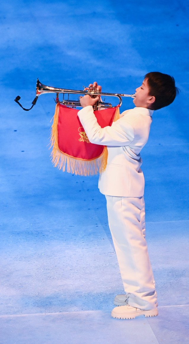 开幕式上还有一个瞬间引发强烈反响。来自北师大实验小学未来科技城学校的朱德恩用小号吹响了《我和我的祖国》,悠扬的号声响彻夜空,动人的旋律直抵人心,现场的观众都情不自禁地一起哼唱。这位小号手身上的衣服主要由设计师高阳绘图。