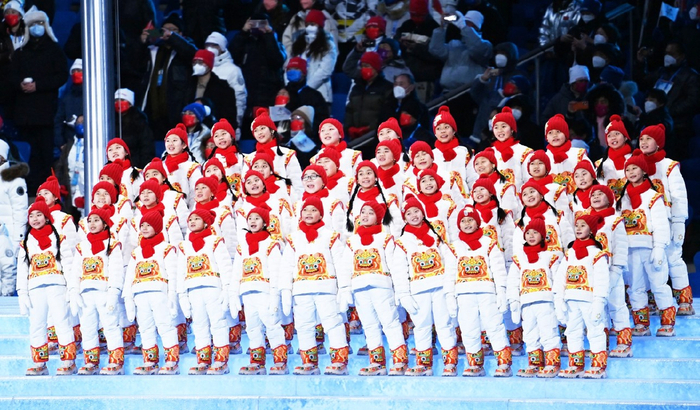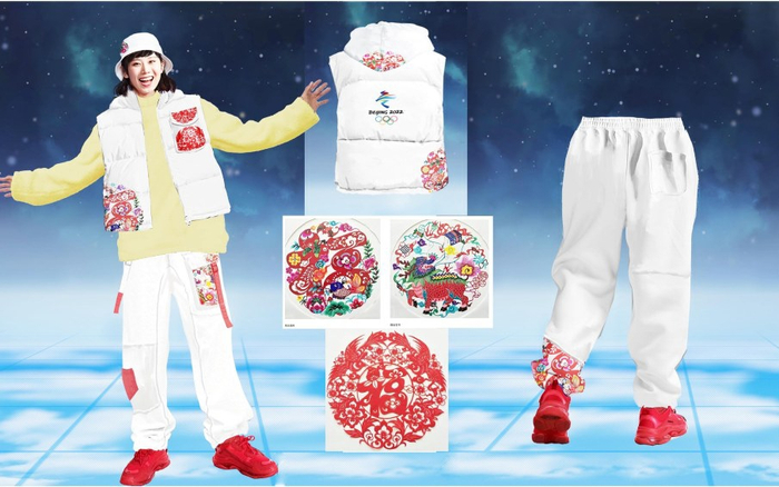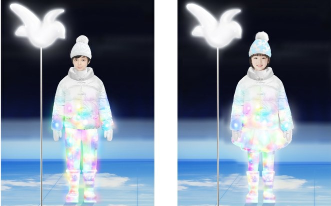 手持白鸽的“剪纸风”造型羽绒服来自陈鹏的团队,设计灵感来源于中国的年画娃娃形象;另外一套“青花蓝”主唱团队儿童的服装造型,由设计师丁洁设计,蓝白主色调取自青花瓷配色,在图案设计中融入了“中国结”等吉祥元素;设计师李重阳参与设计了标兵服装,各国运动员入场时,标兵在两侧夹道欢迎,这套白底红色花纹的服装也给观众们留下了深刻印象,头顶的渔夫帽上有鱼的剪纸图案,侧面有“福”字和“春”字的剪纸图案,浓郁的中国特色凸显了过年的喜庆吉祥;王逢陈设计的奥林匹克会旗护旗手服装很有新意,由艺术印花羽绒服外套和白色西服套装组合而成,以中国传统的山水画为灵感,营造远近虚实的韵律感,万里江山的苍穹蓝与冰川白相得益彰。