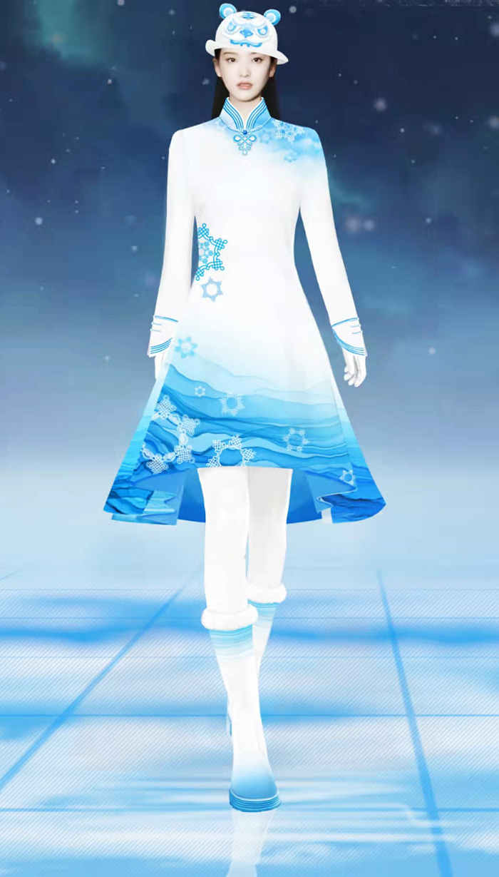开幕式中,引领各国运动员出场的引导员们一亮相,大气精致的着装便赢得了网友盛赞。这是一款中国旗袍样式的礼服,白蓝配色与冰雪的纯洁交相呼应,雪花图案由中国传统结艺编织而成,裙摆则是一幅中国山水画。“这套服装在现场非常出彩,我们在设计上前后改了十几个版本,工艺上精雕细琢,运用多种传统工艺,比如用刺绣和贴花在裙摆的设计上实现山水渐变。每一个细节都很用心。”陈敏正说。