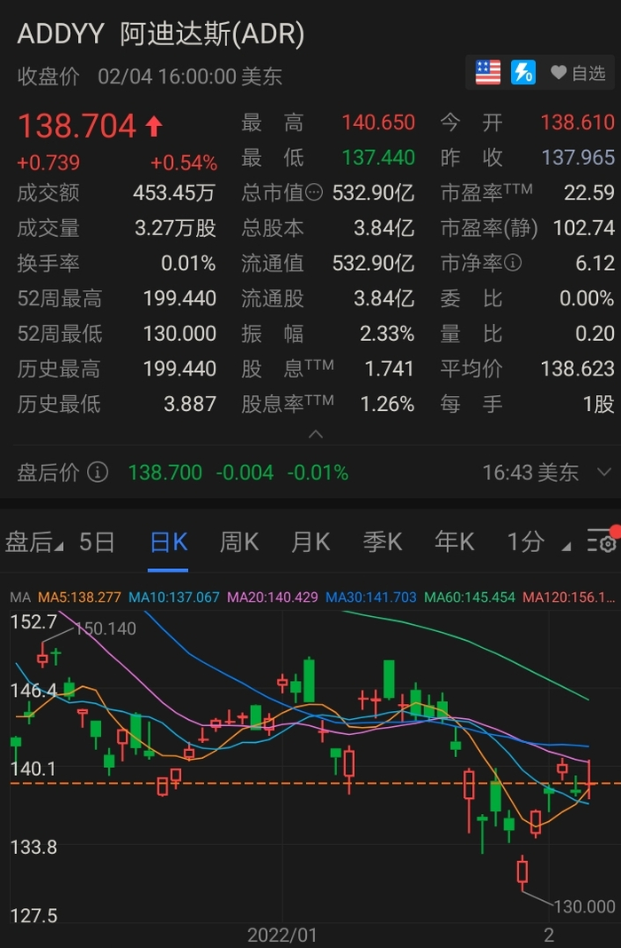 阿迪达斯(ADR)在美股上市,简称ADDYY。公司最新市值532.9亿美元,折合人民币3389.52亿元。