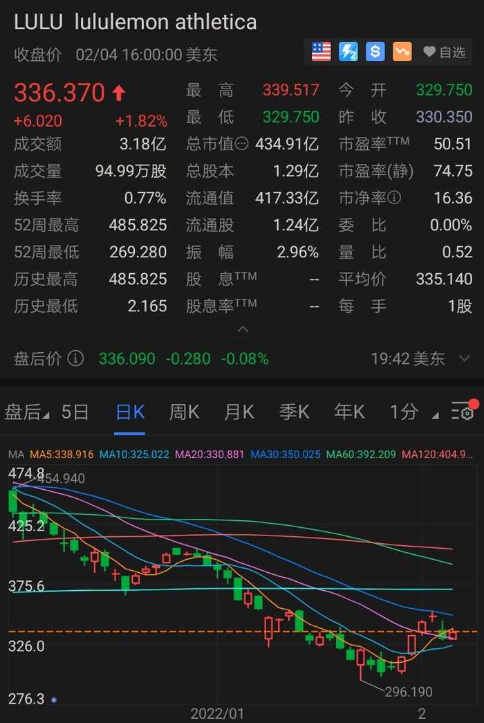 2007年在露露柠檬在纳斯达克上市,目前最新市值为434.91亿美元,折合约2766.22亿元人民币。