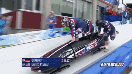 而雪车项目的出发方式,则是运动员先怒吼着把车往前推,再瞅准机会钻进车里。