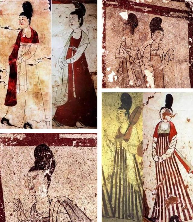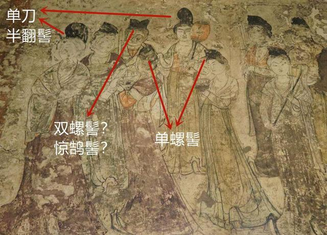 半翻髻属于反绾式梳编法,是在梳头时由下至上,至头顶而向外翻转,形似翻转的荷叶,是由隋代翻荷髻演变而来,流行于初唐时期。段成式《髻鬟品》记载“高祖宫中有半翻髻”,宇文士及《妆台记》称“唐武德中梳半翻髻”。从出土女俑、陵墓壁画可见,从唐高祖至武周朝,半翻髻都十分流行。唐太宗女儿新城长公主墓壁画中,半翻髻仕女很多,武则天孙女永泰公主墓壁画中,也有梳半翻髻仕女,此外还有单螺髻、双螺髻(也有研究者称是惊鹄髻)等。