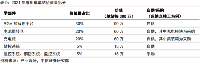 一个换电站的主要零部件包括RGV加解锁平台、电池周转仓、充电柜、站控系统、温控系统、消防系统、监控系统等。目前国内许多换电站设备供应商,例如博众精工等已经可以实现80%的核心零部件自供。