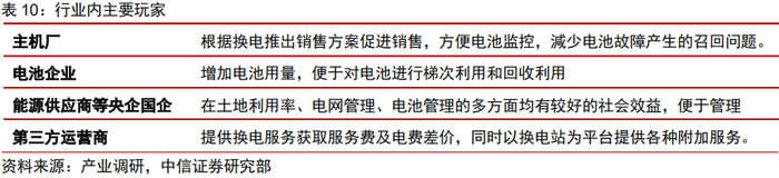 2)电池厂:主要是宁德时代。电池企业通过换电模式可以增加其电池的用量,便于对电池进行梯次利用和回收利用,从而提升电池的单位成本效益。此外,电池企业普遍资金、政府资源实力较强,并且具备一定的第三方属性,因此理论上其在推动换电电池标准化的可能性最大。